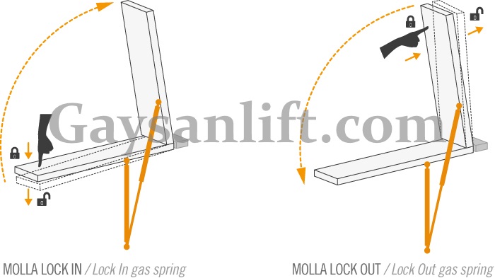 Как показано на рисунке, в первом случае мы можем удерживать пружину в закрытом положении, и после разблокировки пружина сбросит свое усилие, поднимая объект, к которому она приложена. Во втором случае пружина будет заблокирована в открытом положении и после разблокировки можно будет вернуть объект в исходное положение. Блокировка газовой пружиной может производиться без усилия с гидравлическим демпфирующим эффектом во время закрытия.